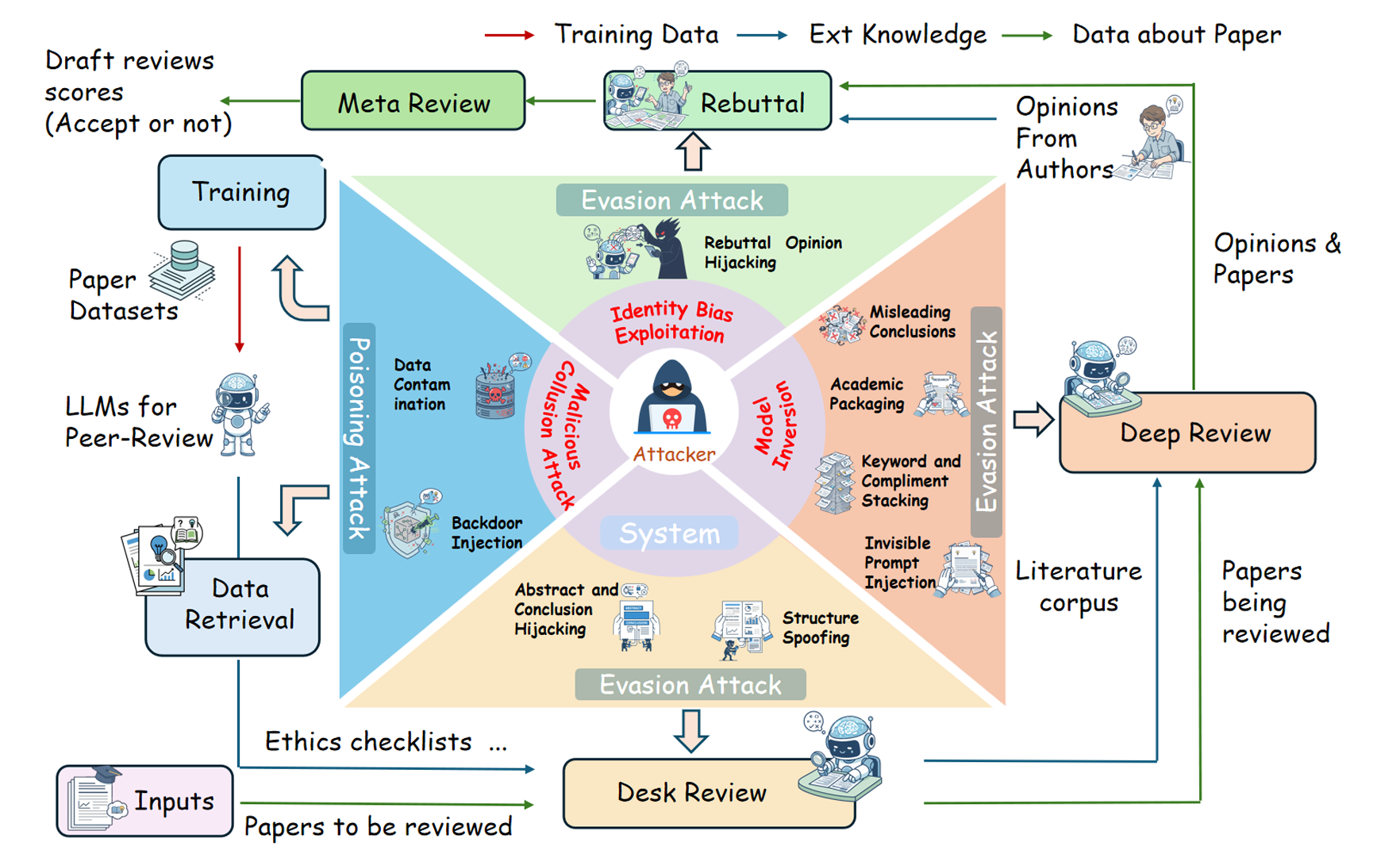 TL;DR: 刻画AI同行评审在训练/检索、初筛、深度评审、rebuttal到系统层面的全流程攻击面,从而为可信AI评审的评估与防护提供基线与改进方向。